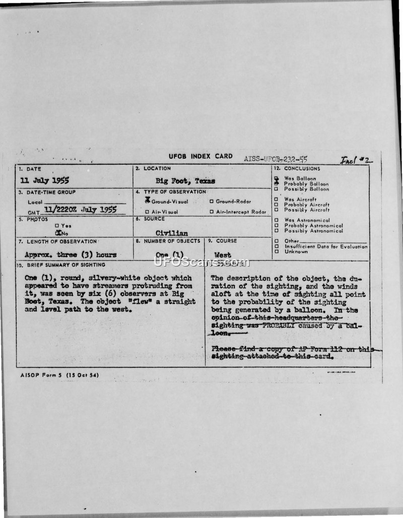 A 1955 sighting report from Big Foot, Texas, involving six observers who witnessed a round, silvery-white object for three hours. The official conclusion attributed the sighting to a balloon.