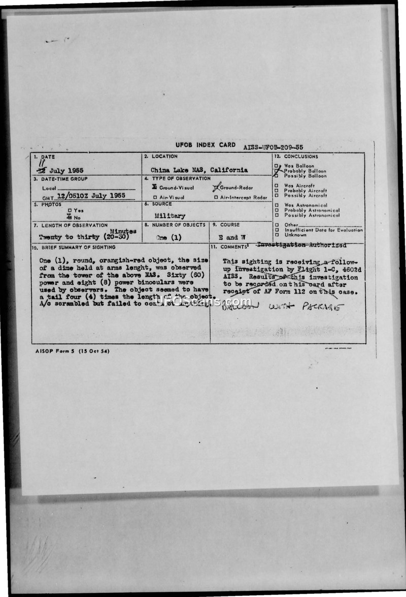 Air Intelligence Information Report: Sighting of Unidentified Object, China Lake Naval Air Facility, 11 July 1955