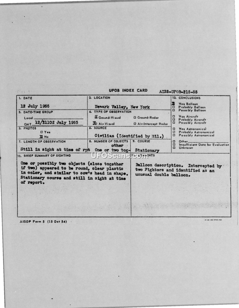 This document is a UFOB Index Card (AISS-UFOB-215-55) documenting a sighting that occurred on 12 July 1955 in Newark Valley, New York. The report describes one or possibly two objects that appeared to be round, clear plastic in color, and similar to a cow's head in shape. At the time of the report, the object or objects were described as being in a stationary course and still in sight. The source of the report is identified as 'Civilian (Identified by Mil.)'. Following the sighting, the object was intercepted by two fighter aircraft. The final conclusion recorded on the card is that the object was a balloon, specifically described in the comments section as an 'unusual double balloon'.