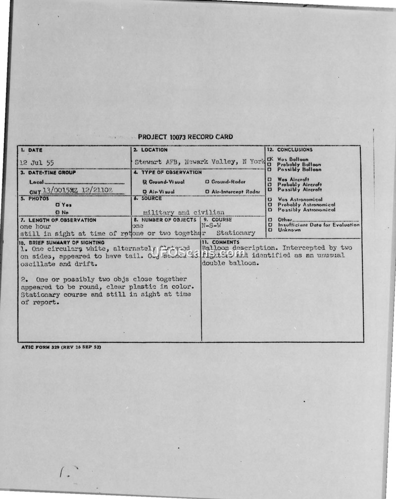Project 10073 Record Card and Associated Teletype Reports — Stewart AFB, 12 July 1955
