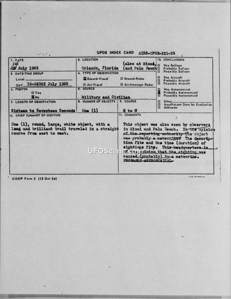 This document is a UFO Index Card, identified as AISS-UFOB-221-55, documenting a sighting that occurred on July 15, 1955, at 0200Z. The event took place in Orlando, Florida, with additional reports originating from Miami and Palm Beach. The witness or witnesses described a single, large, round, white object that possessed a long and brilliant trail. The object was observed traveling in a straight path from east to west for a duration of sixteen to seventeen seconds. The report indicates that the observation was made by both military and civilian sources, though no photographic evidence or radar contact was recorded. The evaluating authority concluded that the object was likely a meteor. This determination was based on the physical description of the object and the duration of the sighting, which the report states fits the characteristics of a meteor. The final assessment explicitly categorizes the event as 'PROBABLY ASTRONOMICAL'.