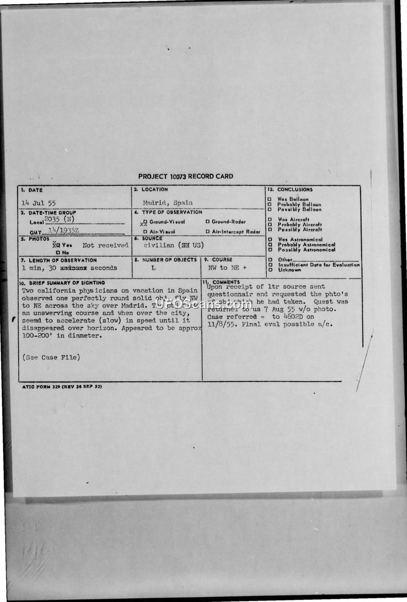 Project 10073 Record Card: Sighting over Madrid, Spain, 14 July 1955