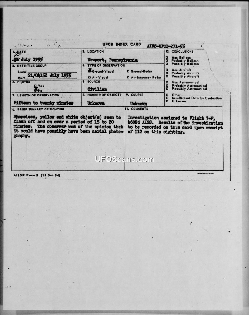 This document is a UFOB Index Card, identified as AISS-UFOB-231-55, documenting a sighting that occurred on July 28, 1955, in Newport, Pennsylvania. The report details a sighting of a shapeless, yellow and white object that was observed flashing on and off for a duration of 15 to 20 minutes. The observer of the phenomenon suggested that the object might have been related to aerial photography. The document indicates that the investigation of this incident was assigned to Flight 3-F of the 4602d AISS. At the time the card was created, the investigation was ongoing, with a note stating that the results would be recorded on the card upon the receipt of further information. The card confirms that no photographs were taken and no radar contact was established. The source of the report is listed as civilian.