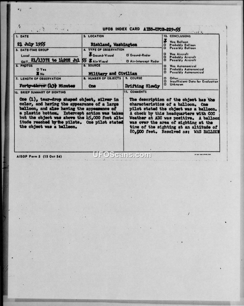 A tear-drop shaped object sighted over Richland, Washington, on July 21, 1955, was investigated by the USAF. The object was officially identified as a high-altitude balloon after weather data confirmed its presence in the area.
