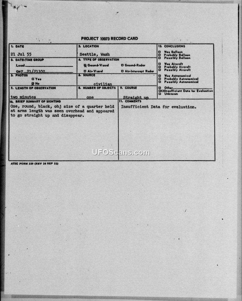 This document consists of a Project 10073 Record Card and an associated teletype report regarding an Unidentified Aerial Phenomena (UFOB) sighting that occurred on July 21, 1955, in Seattle, Washington. The report was filed by the 635th Aircraft Control and Warning (ACW) squadron at McChord Air Force Base. The witness, identified as SSGT A.V. Whitney of the Seattle Ground Observer Corps (GOC), reported observing a single, round, black object. The witness estimated the size of the object to be equivalent to a quarter held at arm's length. According to the report, the object was observed overhead and appeared to move straight up before disappearing. The duration of the observation was approximately two minutes. The report explicitly notes that no photographs were taken and no radar contact was made. The official conclusion reached by the evaluating authorities was that there was insufficient data to provide a definitive explanation for the sighting. Consequently, it was determined that an AF Form 112 would not be submitted for this incident. The documentation follows standard military reporting procedures for the era, specifically citing AFR 200-2, paragraph 7, as the regulatory basis for the submission.