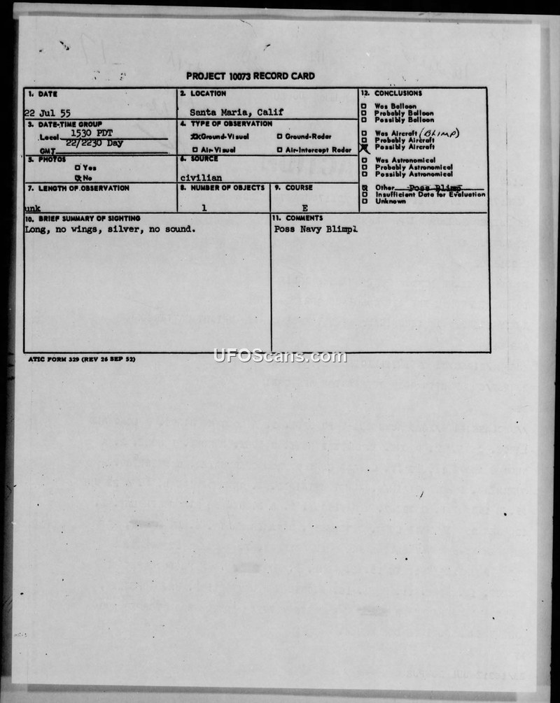 A civilian reported a wingless, silver object over Santa Maria, California, on July 22, 1955. The Air Technical Intelligence Center concluded the object was likely a Navy blimp.