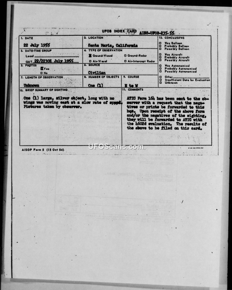 UFOB Index Card ATSS-UFOB-235-55 — Santa Maria, California, 22 July 1955