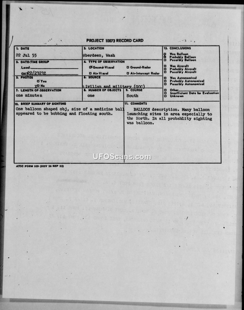 PROJECT 10073 RECORD CARD — Aberdeen, Washington, 22 July 1955