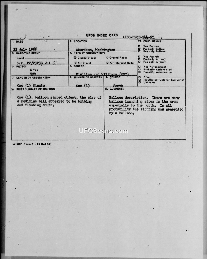 A 1955 sighting report from Aberdeen, Washington, describing a balloon-shaped object. The incident was officially attributed to a balloon due to the proximity of multiple launch sites.