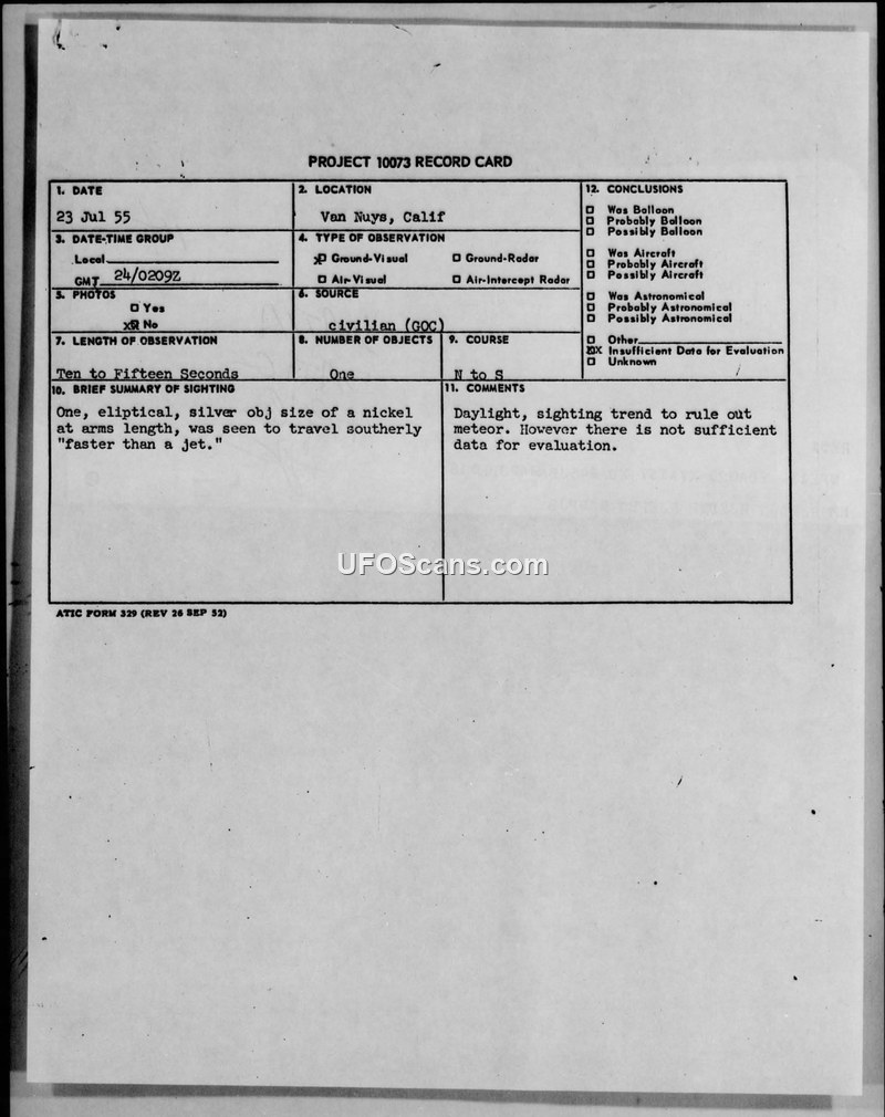A civilian reported a fast-moving, silver, elliptical object in Van Nuys, California, on July 23, 1955. Military authorities concluded there was insufficient data to identify the object.