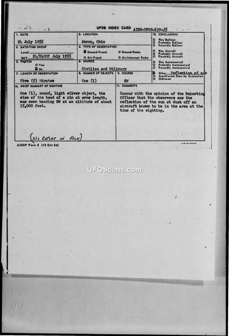 A 1955 sighting report from Akron, Ohio, identifying a UFO as a sun reflection off an aircraft. The document notes that no formal case report exists in the file.