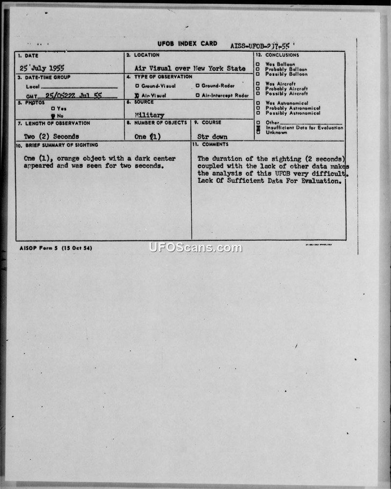 A brief two-second sighting of an orange object with a dark center occurred over New York State on July 25, 1955. The report concludes that there was insufficient data to evaluate the incident.