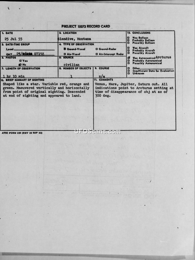 A July 1955 sighting in Glendive, Montana, of a multi-colored, maneuvering object was investigated by the 4602d AISS. The final official conclusion identified the object as the star Arcturus.