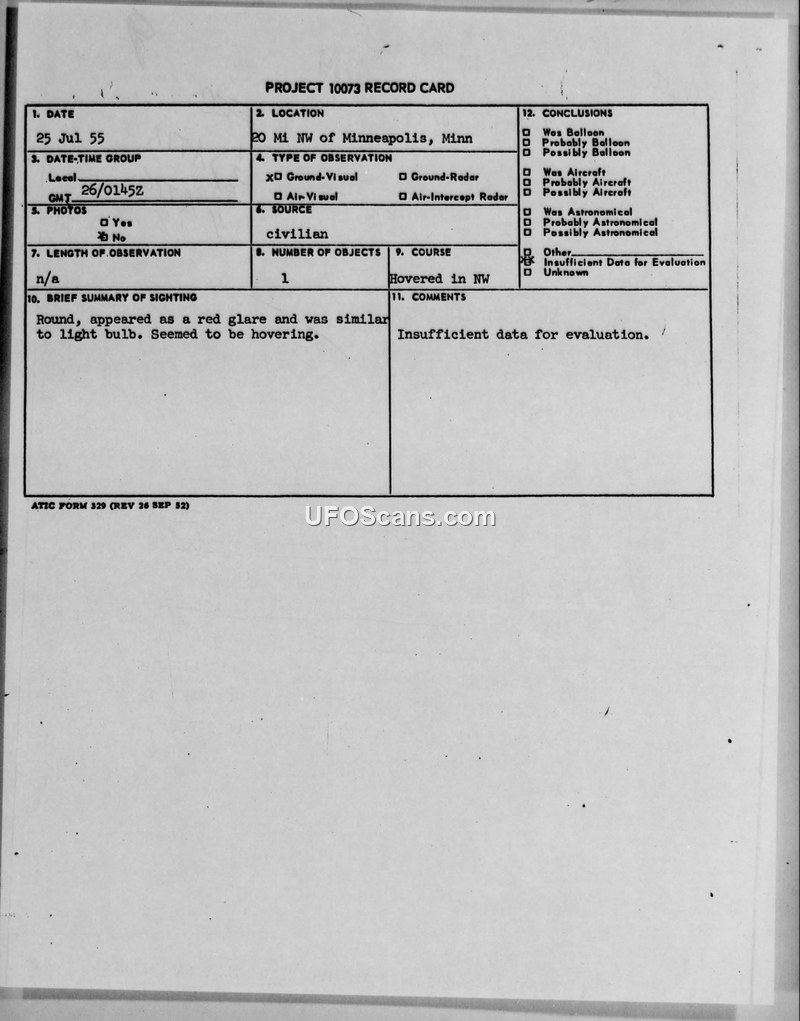 This document consists of a Project 10073 record card and an associated teletype message regarding an unidentified aerial phenomenon reported on July 25, 1955. The sighting occurred 20 miles northwest of Minneapolis, Minnesota, at approximately 0145Z on July 26, 1955. The witness, identified only as a civilian, reported observing a single, round object that appeared as a red glare, which the witness compared to a light bulb. The object was observed to be hovering in the northwest. The teletype communication, directed to the 31st Air Division at St. Paul, Minnesota, and the Air Technical Intelligence Center (ATIC) at Wright-Patterson Air Force Base, notes that a cloud passed in front of the object, but the observer was still able to see it. The report explicitly states that the object was hovering. The official conclusion recorded on the project card is that there was insufficient data for evaluation. No photographic evidence was obtained, and there was no radar contact associated with the sighting. The documentation reflects the standard administrative process for reporting and evaluating UAP sightings during this period, involving coordination between regional air divisions and the central intelligence agency at Wright-Patterson.