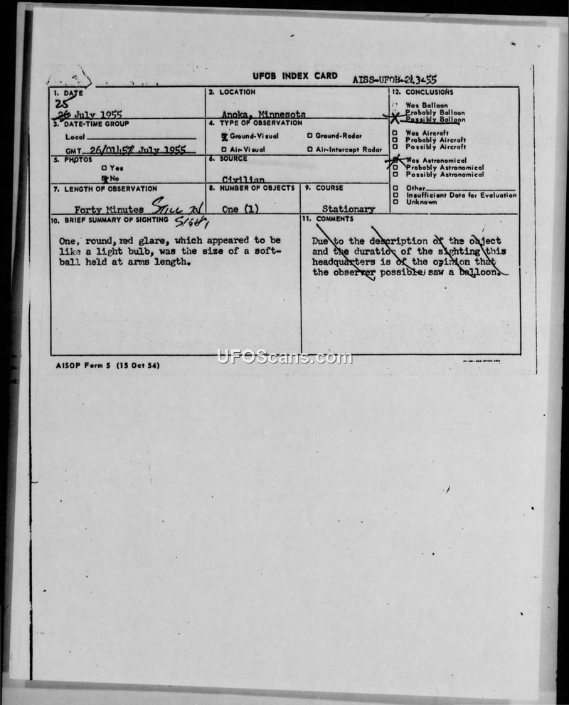 A civilian witness reported a stationary, red, light-bulb-shaped object in Anoka, Minnesota, on July 25, 1955. The Air Intelligence Service Squadron (AISS) concluded the object was possibly a balloon.