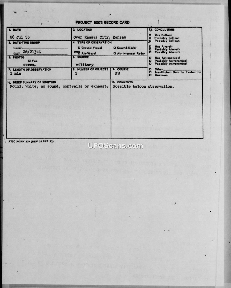 PROJECT 10073 RECORD CARD — Sighting of 26 July 1955