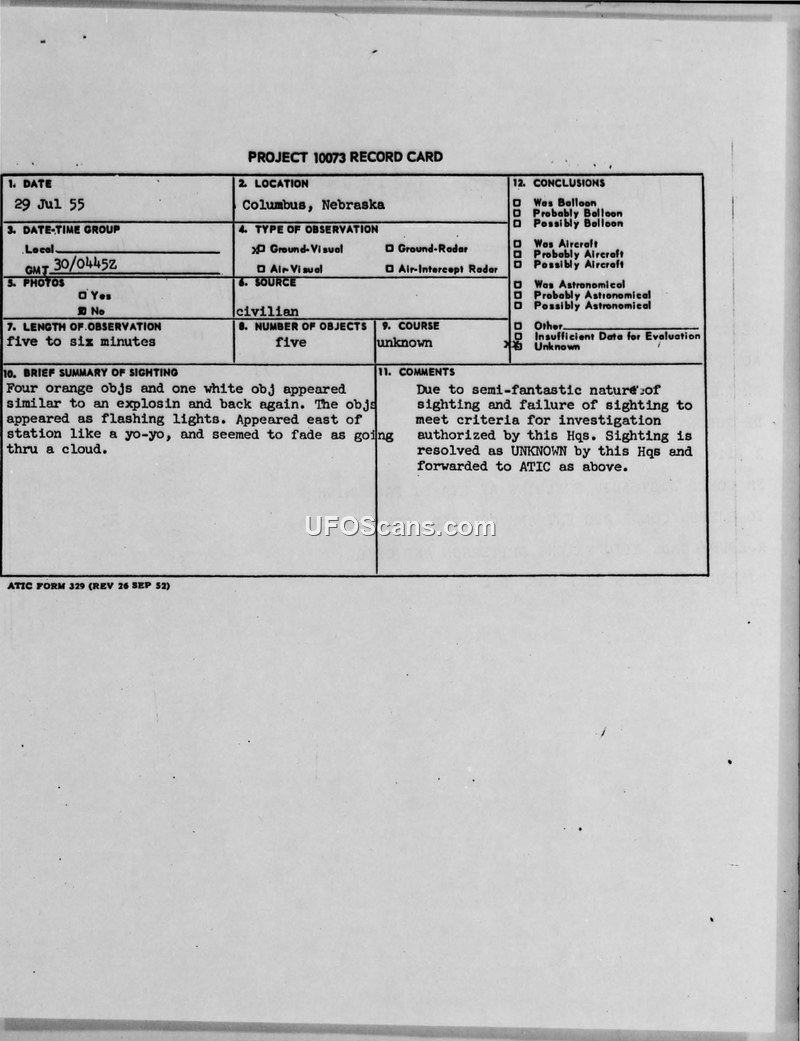Project 10073 Record Card — Columbus, Nebraska, 29 July 1955