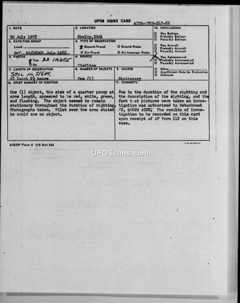 On 30 July 1955, a group of observers at a Ground Observer Corps (GOC) post in Shelby, Iowa, reported a stationary object in the sky for over two and a half hours. The witnesses, including the manager of the Shelby Fertilizer Company and an accountant, described the object as appearing the size of a quarter penny held at arm's length, displaying red, white, and green flashing lights. Photographs were taken of the object, and a B-25 aircraft (AF8170) was directed to the area to investigate, but the pilot reported seeing nothing. The 4602d AISS conducted an investigation, which included checking with the University of Minnesota Observatory and local research agencies. The preparing officer initially suggested the object might be an aircraft, noting the flashing lights and lack of motion. However, the approving officer at headquarters disagreed, citing the excessive duration of the sighting and the object's stationary nature. The final conclusion offered by the headquarters was that the sighting was likely caused by a rawinsonde balloon, with the flashing lights and light beams attributed to the oscillation of the balloon's suspension train in wind currents. The film developed by the 514th Materiel Squadron Photo Lab yielded no results.