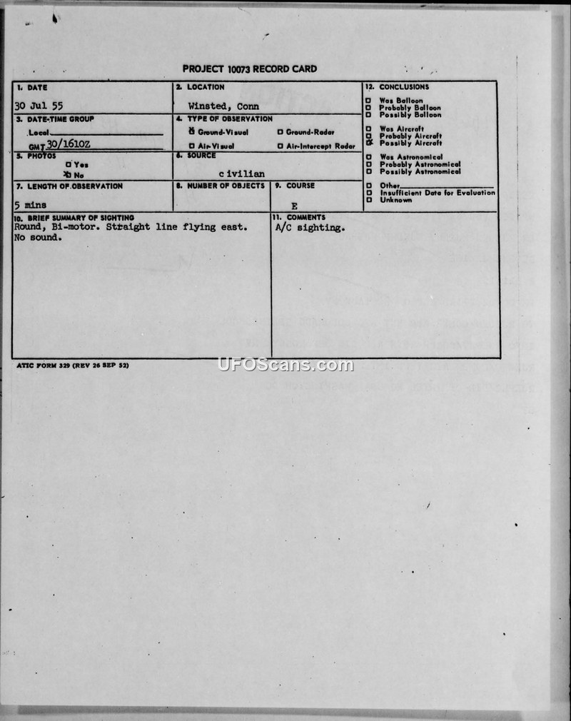 Project 10073 Record Card — Winsted, Conn, 30 Jul 55