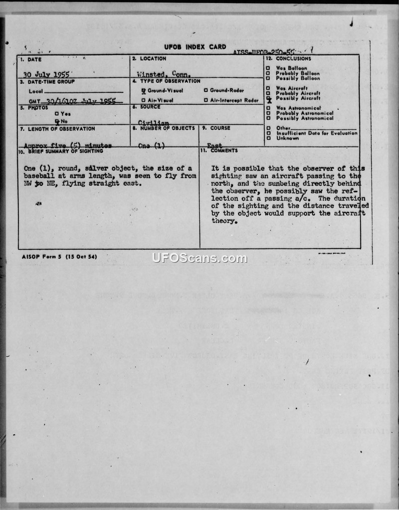 A 1955 sighting report of a silver, round object in Winsted, Connecticut, which was officially attributed to a reflection off a passing aircraft.