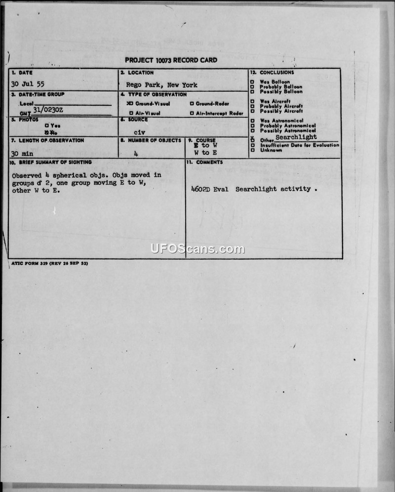 Project 10073 Record Card — Rego Park, New York, 30 July 1955