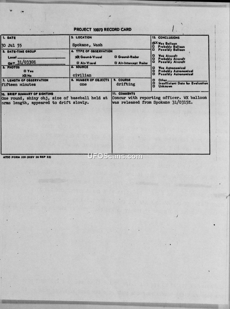 Project 10073 Record Card — Spokane, Washington, 30 July 1955