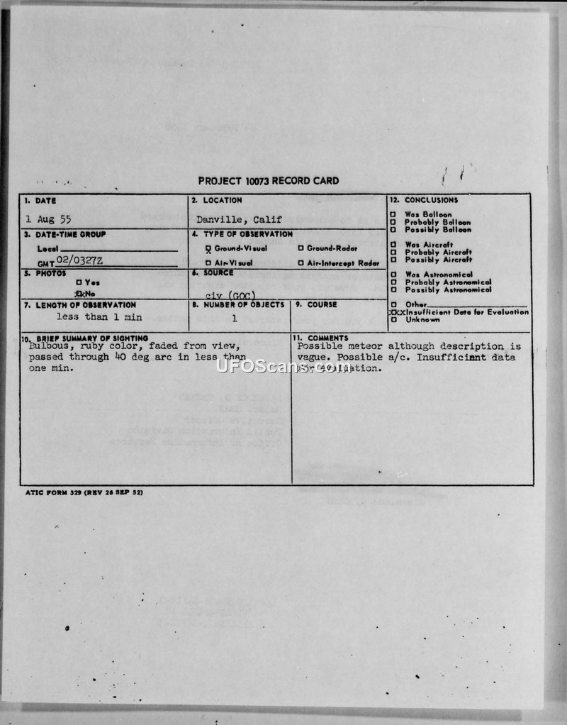 Unidentified Flying Object Report — Danville, California, 2 August 1955