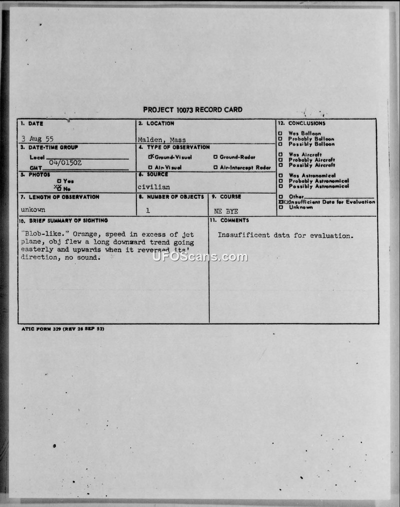 A civilian witness in Malden, Massachusetts, reported a fast-moving, orange, blob-like object on August 3, 1955. The military investigation concluded that there was insufficient data to evaluate the sighting.