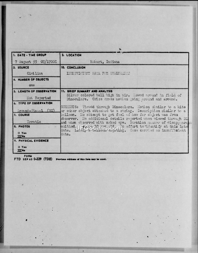 A 1955 sighting of a silver ball in Hobart, Indiana, was reported to the Air Force in 1965. The case was classified as 'insufficient data' and likely a balloon, despite the witness's detailed description of erratic movement.