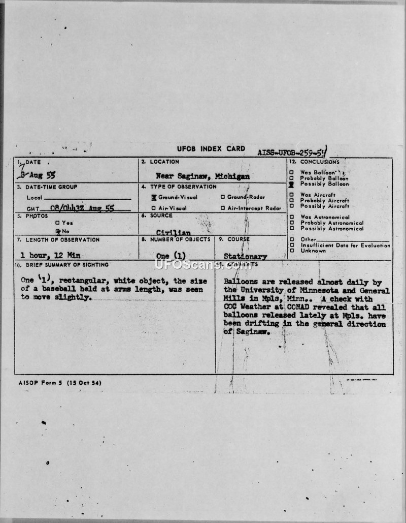 This document is a UFOB Index Card (AISS-UFOB-259-59) detailing a sighting that occurred on August 7, 1955, near Saginaw, Michigan. The witness reported observing a single, rectangular, white object for a duration of one hour and twelve minutes. The object was described as being the size of a baseball held at arm's length and was observed to move slightly. The observation was classified as ground-visual, with no radar contact or photographic evidence reported. The official conclusion reached on the card is that the object was 'Possibly Balloon'. The comments section provides context for this conclusion, stating that balloons are released almost daily by the University of Minnesota and General Mills in Minneapolis, Minnesota. Furthermore, a check with CONAD weather services revealed that all balloons released from Minneapolis during that period had been drifting in the general direction of Saginaw, suggesting a likely explanation for the sighting.