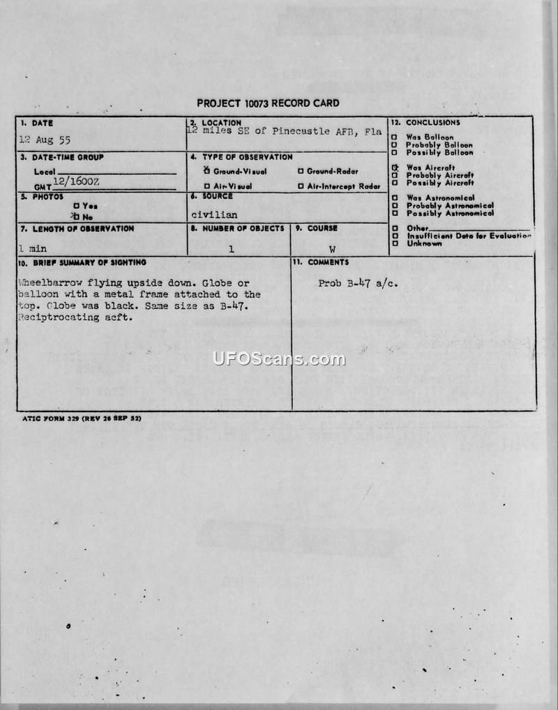 On August 12, 1955, at approximately 1600Z, a civilian witness located 12 miles southeast of Pinecastle Air Force Base, Florida, reported observing an unidentified aerial object. The witness described the object as resembling a wheelbarrow flying upside down, consisting of a black globe or balloon with a metal frame attached to the top. The object was estimated to be the same size as a B-47 aircraft and produced a sound similar to a reciprocating engine aircraft. The observation lasted for approximately one minute, during which the object was seen traveling on a straight and level course heading due west before moving out of the range of vision. The weather conditions at the time included scattered showers, a west wind at 25 knots, and significant cloud cover, including a measured overcast at 3,200 feet and thunderstorms in the southwest quadrant. Although the Pinecastle AFB weather station had released a black weather balloon at 1120 hours that day, which had reversed its direction, the official evaluation conducted by the Deputy Director of Operations for the 813th Air Division concluded that the witness likely observed a B-47 aircraft. The report suggests that the B-47 was performing a penetration maneuver to Pinecastle AFB with its aft main landing gear extended. The evaluators further noted that the presence of heavy cumulus clouds in the area could have caused sun reflections, potentially creating a halo effect around the aircraft that contributed to the witness's unusual description.