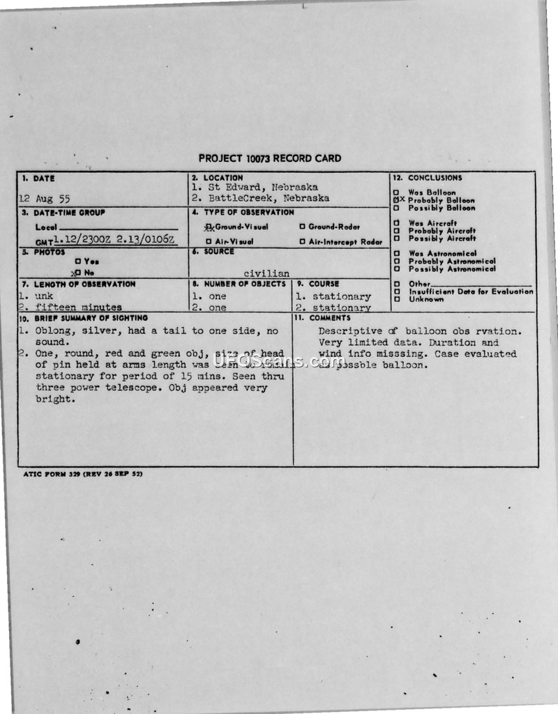 Project 10073 Record Card — St Edward and Battle Creek, Nebraska, 12 August 1955