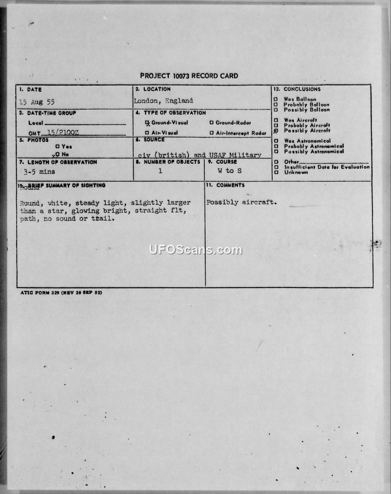 PROJECT 10073 RECORD CARD — London, England, 15 August 1955