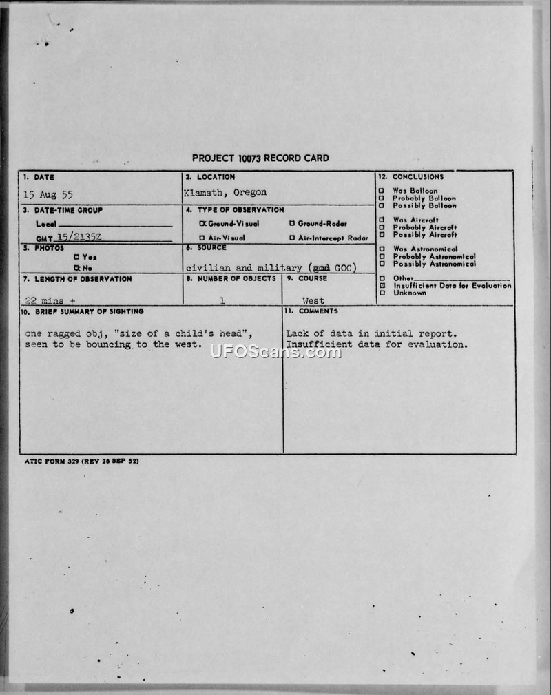 Project 10073 Record Card — Klamath, Oregon, 15 August 1955
