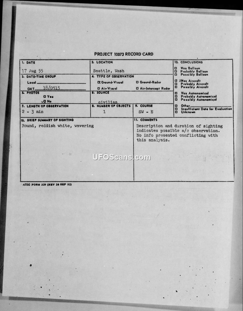 Project 10073 Record Cards and Related Teletype Reports — Seattle, Washington, August 1955