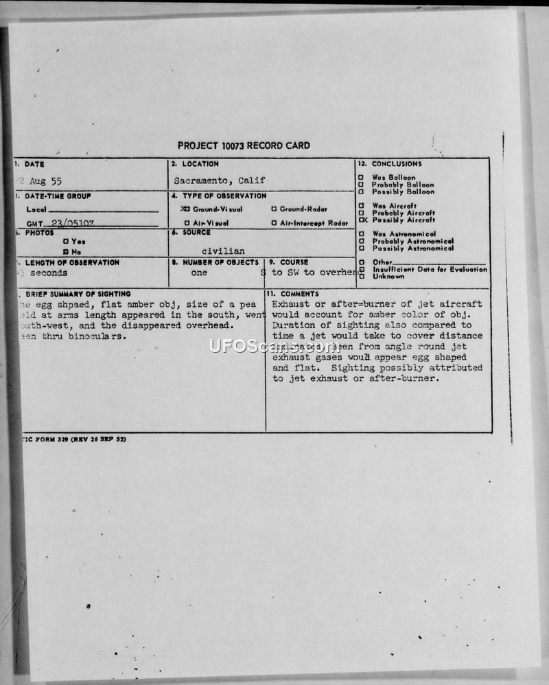 A 1955 sighting of an amber, egg-shaped object in Sacramento, California, was investigated by the Air Technical Intelligence Center. The military concluded the object was likely the exhaust or after-burner of a jet aircraft.