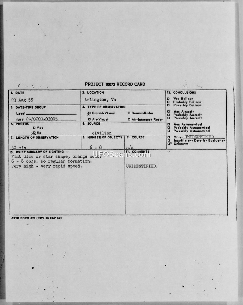 Project 10073 Record Card and Air Intelligence Information Report — Arlington, Virginia, 23 August 1955