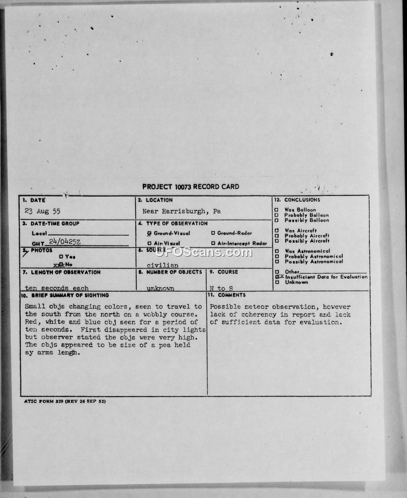 Project 10073 Record Card — Near Harrisburgh, Pa, 23 Aug 55