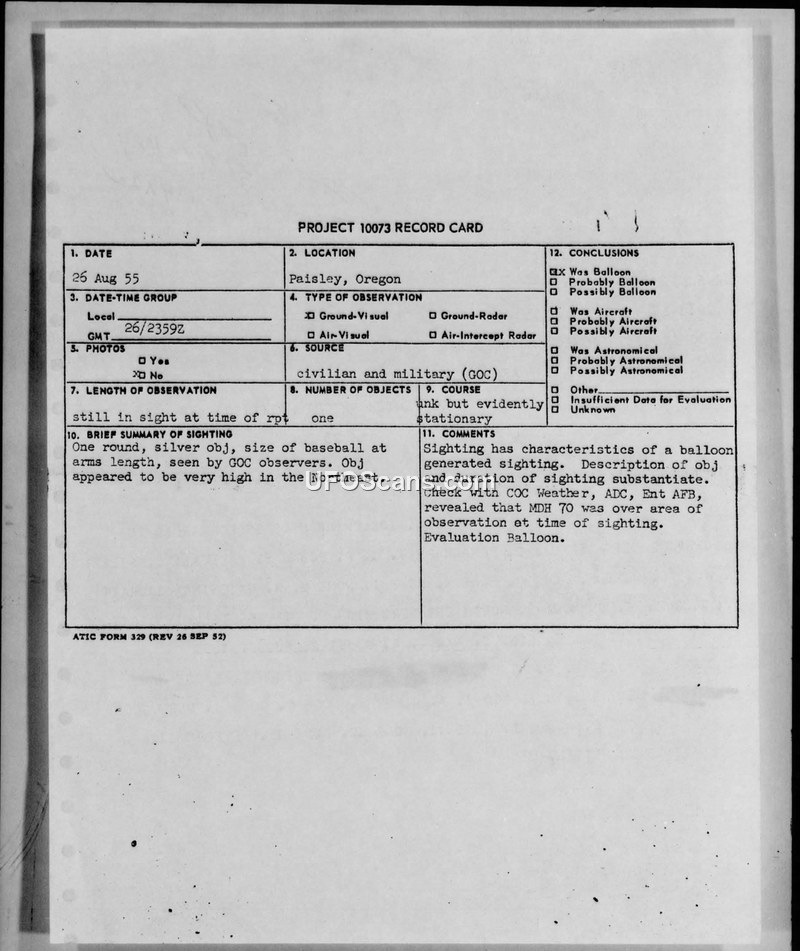 Project 10073 Record Card — Paisley, Oregon, 26 August 1955