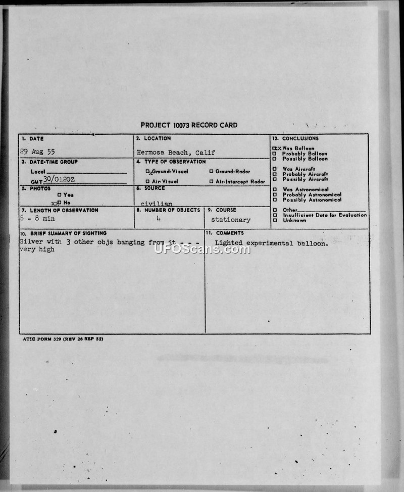 A civilian reported a stationary, high-altitude sighting of four objects over Hermosa Beach, California, on August 29, 1955. The Air Technical Intelligence Center concluded the objects were a lighted experimental balloon.
