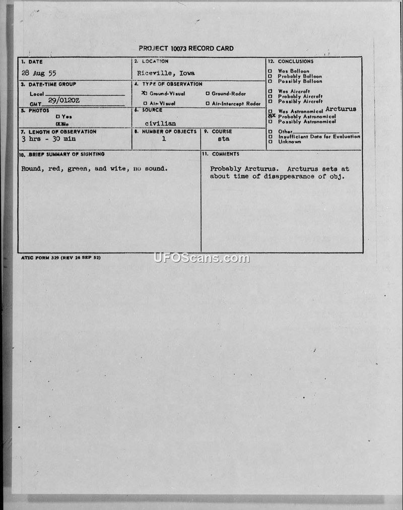 Project 10073 Record Card — Riceville, Iowa, August 28, 1955