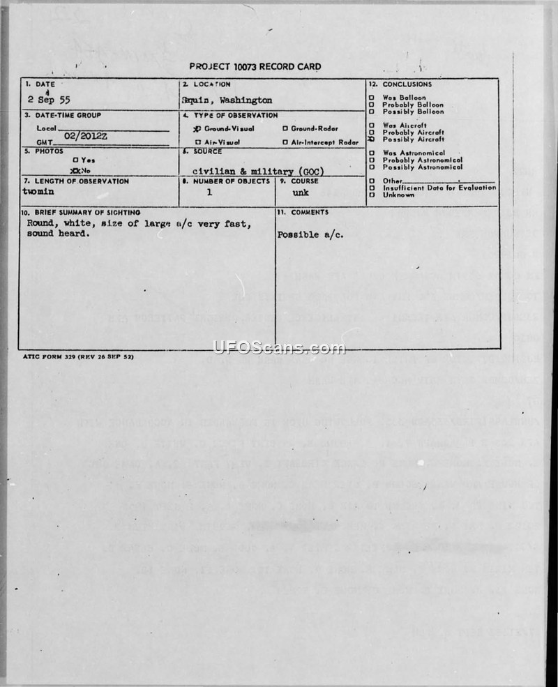 Project 10073 Record Card — Sequim, Washington, 2 September 1955