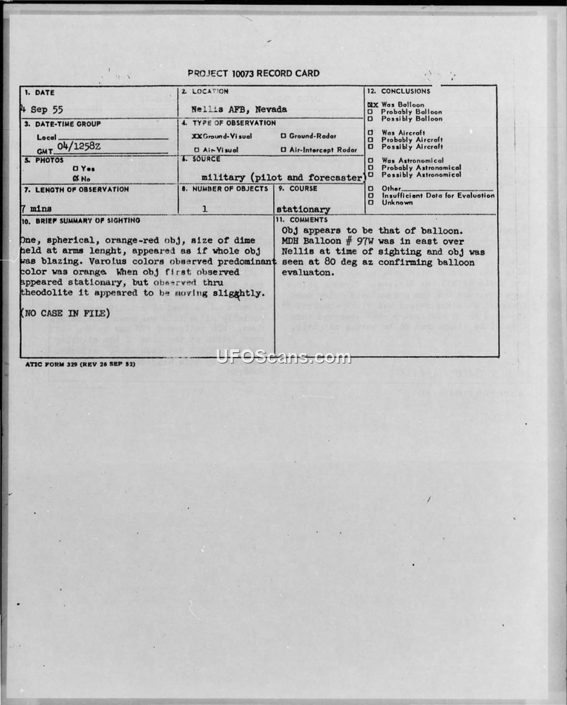A 1955 sighting of a spherical, orange-red object at Nellis AFB was investigated under Project 10073. The object was officially identified as MDH Balloon #97W.