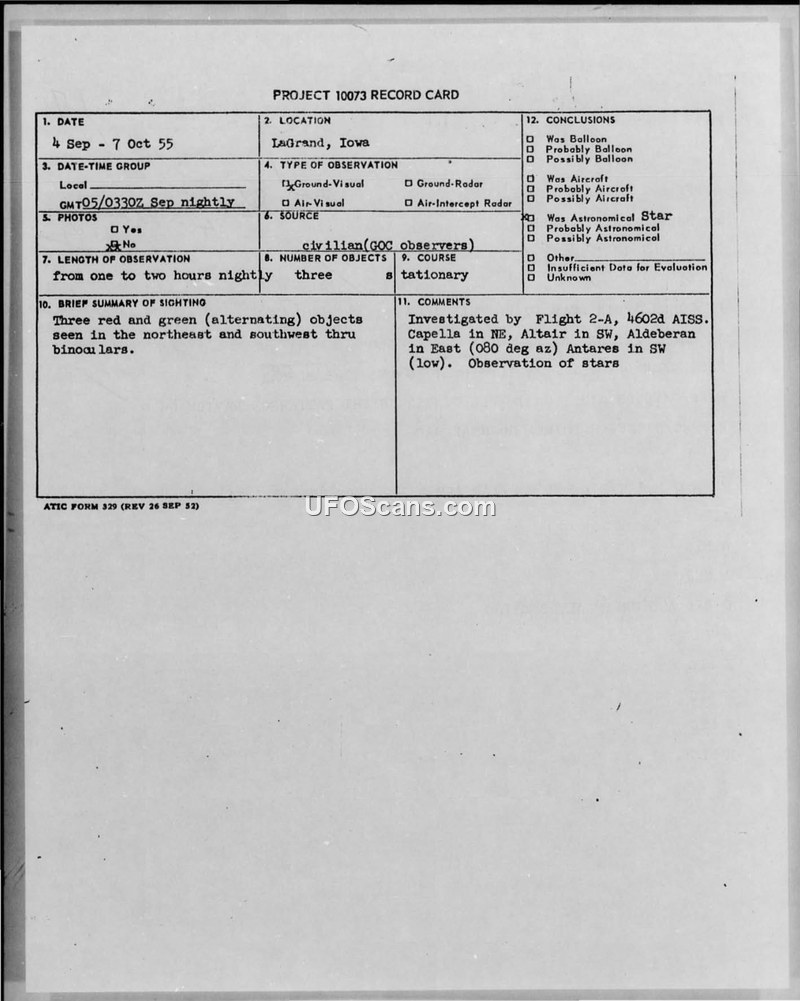 This document details a series of Unidentified Aerial Phenomena (UAP) sightings reported between September 4 and October 7, 1955, in the vicinity of Le Grand and Marshalltown, Iowa. The primary witness, Robert Tierson, a farmer and Ground Observer Corps (GOC) observer, reported observing three stationary objects in the sky for approximately two hours and fifteen minutes nightly. He described the objects as round, pinhead-sized, and exhibiting alternating red and green flashing lights. A second witness, a service station attendant in Marshalltown, reported observing one of these objects from the top of a hotel, noting it appeared as a steady green light with a flashing red light. The investigation was conducted by Flight 2-A of the 4602nd Air Intelligence Squadron (AISS). The investigators performed a thorough check of research agencies in the Minneapolis area to rule out the presence of weather balloons, specifically noting that 'Moby Dick' balloons did not match the description provided by the witnesses. The University of Minnesota observatory also reported no unusual activity in their logs for the nights in question. Despite the initial difficulty in identifying the objects, the preparing officer, 2nd Lt. Walter E. Sampson, concluded that the sightings were likely astronomical in nature. He suggested that the objects were stars or planets, such as Capella, Altair, Aldebaran, and Antares, and that the observed red and green flashing lights were the result of atmospheric scintillation. This conclusion was concurred with by the approving officer, Colonel John M. White Jr., who noted the consistency of the sightings over five successive nights as further evidence of their astronomical origin. The report includes various teletype communications between military units, including the 789th and 788th AC&W Squadrons, documenting the administrative handling of the reports under Project 10073. The documentation emphasizes the lack of radar contact and the absence of any physical evidence, ultimately classifying the event as an astronomical phenomenon.