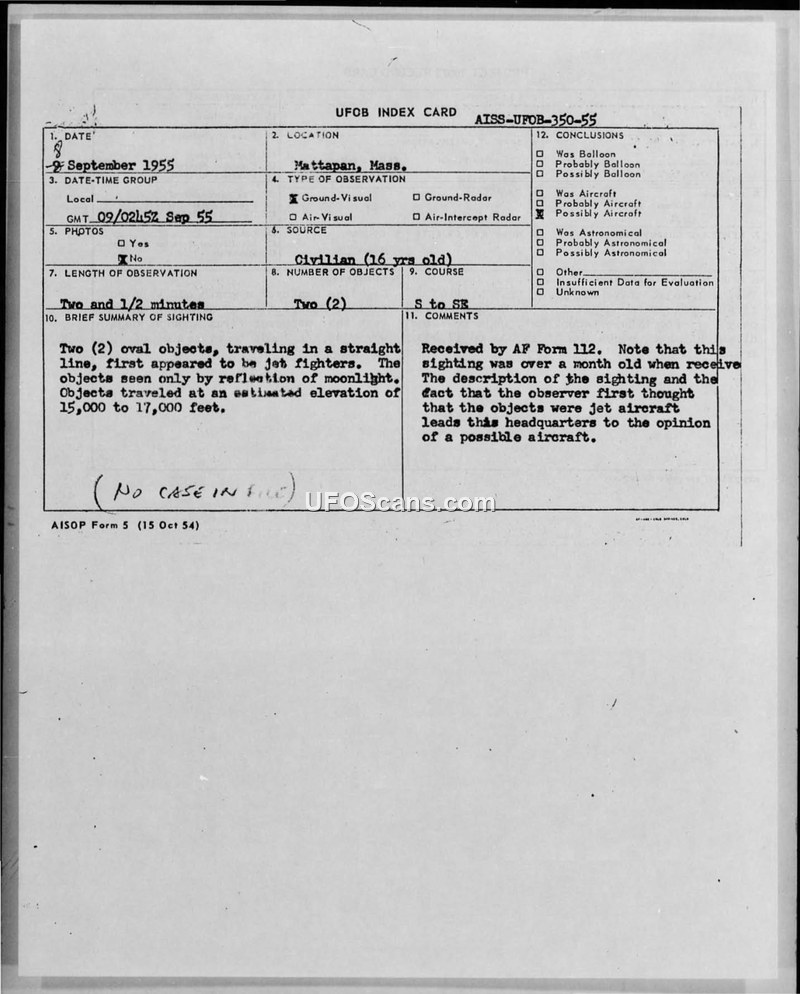 This document is a UFOB Index Card (AISS-UFOB-350-55) detailing a sighting reported by a 16-year-old civilian in Mattapan, Massachusetts, on September 8, 1955. The observer reported seeing two oval objects traveling in a straight line from the South to the Southeast. The objects were observed for approximately two and a half minutes at an estimated altitude of 15,000 to 17,000 feet. The witness noted that the objects were visible only by the reflection of moonlight and initially appeared to be jet fighters. The report was received via AF Form 112, though it was noted that the sighting was over a month old by the time it reached the authorities. Because of the significant delay in reporting and the observer's initial impression that the objects were jet aircraft, the evaluating headquarters concluded that the objects were possibly aircraft. The document explicitly states that there is no case file associated with this report.