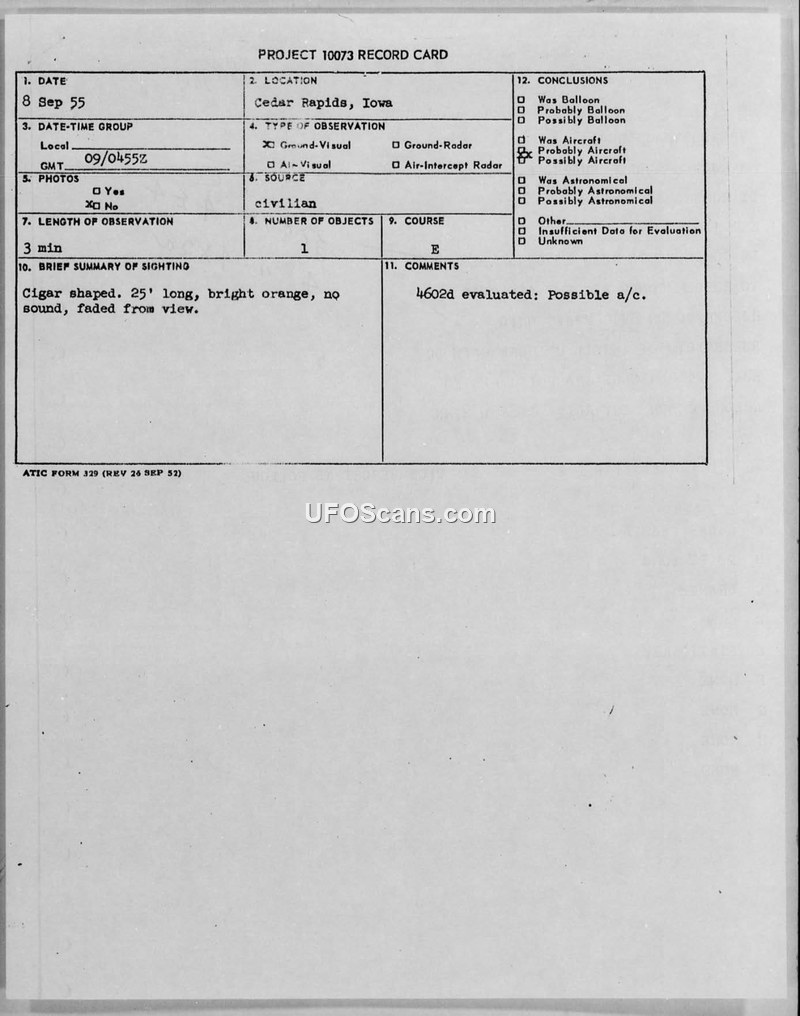 Project 10073 Record Cards and Air Intelligence Information Reports — Cedar Rapids, Iowa, September 1955