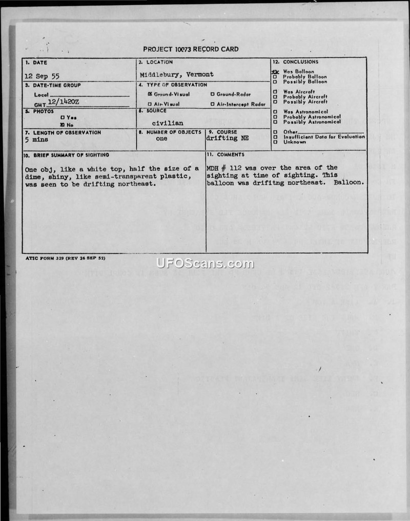 A sighting of a white, top-shaped object in Vermont on September 12, 1955, was investigated by the Air Force. The object was officially identified as a weather balloon (MDH # 112).