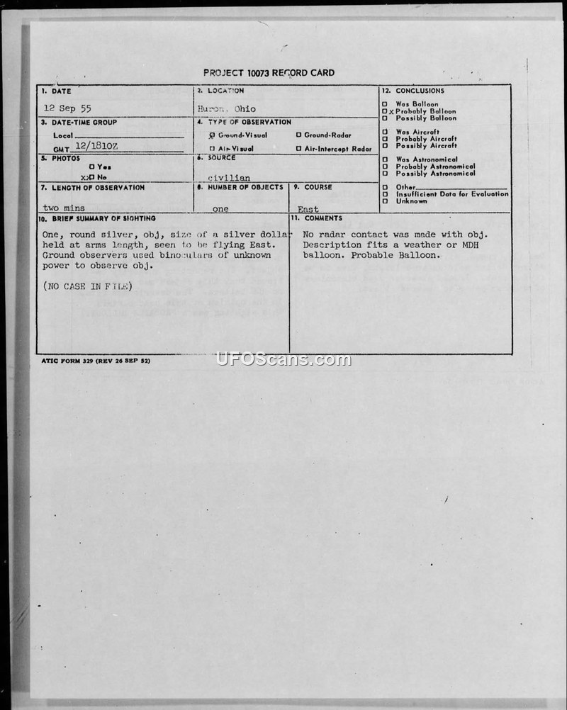 A civilian sighting of a round, silver object in Huron, Ohio, on September 12, 1955, was investigated by AISS. The object was officially identified as a probable weather or MDH balloon.
