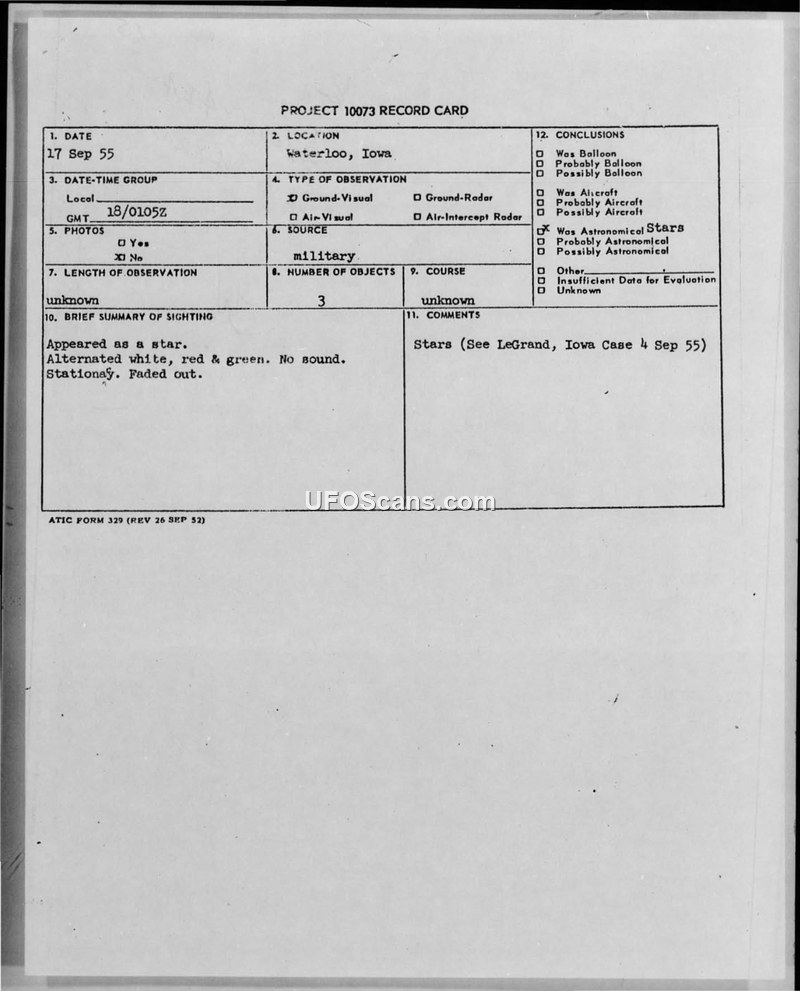 Project 10073 Record Card — Waterloo, Iowa, 17 Sep 55