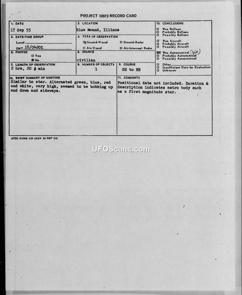 Project 10073 Record Card — Blue Mound, Illinois, 17 Sep 55